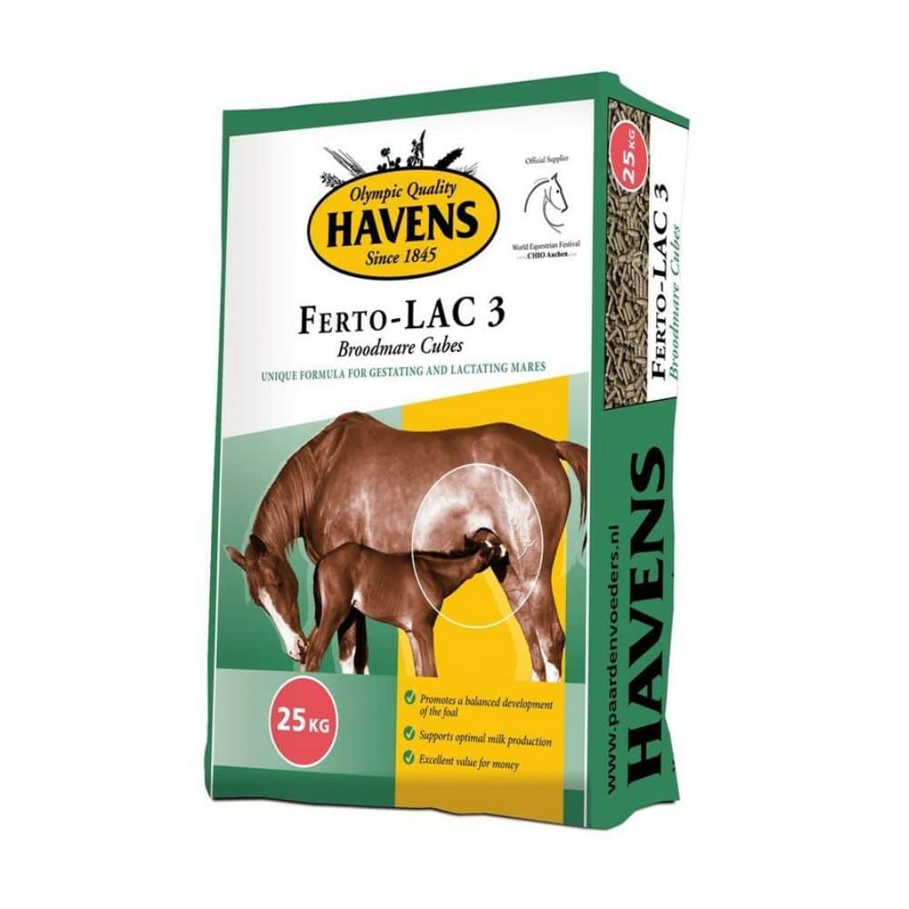 Havens Ferto-Lac 3 (25kg) is een merriebrok met extra eiwitten, mineralen en vitaminen. Ondersteunt drachtige en lacterende merries in melkproductie, botgroei en veulenontwikkeling. Ook geschikt voor dekhengsten.